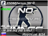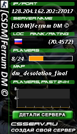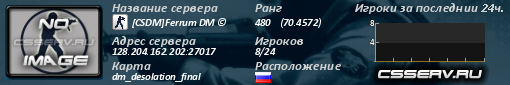 IP адрес: 128.204.162.202:27017 Данные по серверу были обнавлены 07.11.2025 12:00 Название сервера: [CSDM]Ferrum DM © Текущая карта: dm_luna_temple На сервере сейчас играют: 7 / 24 игроков Ранг: 480 (+59) (70.46 онлайн+голоса) CЕРВЕР В СПИСКЕ на 5 странице |