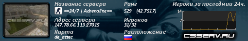 IP адрес: 147.78.66.113:27015 Данные по серверу были обнавлены 29.03.2026 03:00 Название сервера: ==24/7 | Adrenaline== Текущая карта: de_aztec На сервере сейчас играют: 31 / 32 игроков Ранг: 529 (-529) (42.75 онлайн+голоса) CЕРВЕР В СПИСКЕ на 6 странице |