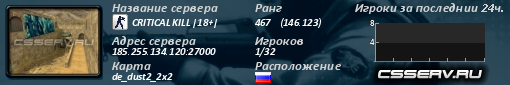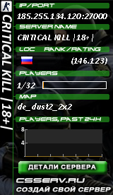 185.255.134.120:27000 | CRITICAL KILL |18+| | de_dust2_2x2 |