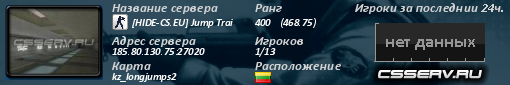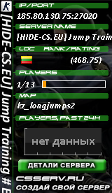 IP адрес: 185.80.130.75:27020 Данные по серверу были обнавлены 08.04.2026 19:30 Название сервера: [HIDE-CS.EU] Jump Training # Europe Текущая карта: c21_kitty_end На сервере сейчас играют: 1 / 13 игроков Ранг: 400 (+1) (468.75 онлайн+голоса) CЕРВЕР В СПИСКЕ на 5 странице |