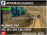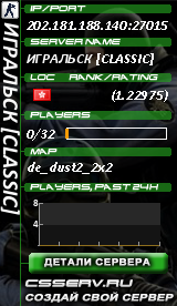 202.181.188.140:27015 | ИГРАЛЬСК [CLASSIC] | de_mirage_2x2 |
