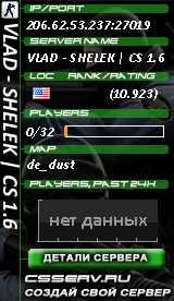 IP адрес: 206.62.53.237:27019 Данные по серверу были обнавлены 02.04.2026 19:30 Название сервера: VLAD - SHELEK | CS 1.6 Текущая карта: de_nuke На сервере сейчас играют: 0 / 32 игроков Ранг: 568 (10.92 онлайн+голоса) CЕРВЕР В СПИСКЕ на 6 странице |