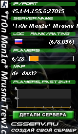 IP адрес: 45.144.155.6:27015 Данные по серверу были обнавлены 03.10.2025 03:30 Название сервера: *Tr0n Man1a* Mrusna Trew1chka Текущая карта: de_dust2 На сервере сейчас играют: 6 / 28 игроков Ранг: 358 (+15) (678.10 онлайн+голоса) ![]() CЕРВЕР В СПИСКЕ на 5 странице |