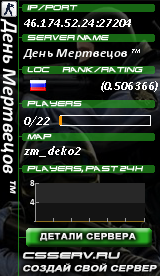 Мониторинг серверов собирает статистику с большого количества серверов, поэтому для поиска нужного Вам сервера воспользуйтесь специальной формой, где Вы можете задать необходимые параметра сервера, такие как: карта, количество игроков, название сервер и другие. Также у нас есть быстрый поиск по айпи адресу сервера, данный поиск нужен, если Вы хотите посмотреть статистику сервера.