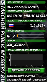 46.174.54.31:27015 | МЯСНОЙ PUBLIC MYSSERV.RU | de_dust2_2x2 |