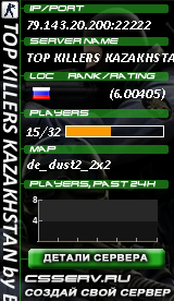 79.143.20.200:22222 | TOP KILLERS KAZAKHSTAN by BROTHERS | de_dust2_2x2 |