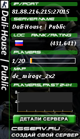 |  | IP адрес: 81.88.216.215:27015 Данные по серверу были обнавлены 31.10.2025 20:50 Название сервера: Dali-House | Public Текущая карта: de_dust2_2x2 На сервере сейчас играют: 1 / 20 игроков Ранг: 397 (434.59 онлайн+голоса)   CЕРВЕР В СПИСКЕ на 5 странице | Платные услуги мониторинга Купить голоса Купить ТОП Купить ВИП Выделить цветом |