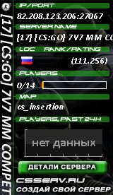 IP адрес: 82.208.123.206:27067 Данные по серверу были обнавлены 23.10.2025 16:10 Название сервера: [17] [CS:GO] 7V7 MM COMPETITIVE| D00X.RU | ANTICHEAT |NO PLUGINS Текущая карта: de_alexandra На сервере сейчас играют: 0 / 14 игроков Ранг: 11 (111.26 онлайн+голоса) ![]() CЕРВЕР В СПИСКЕ на 1 странице |
