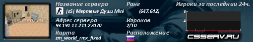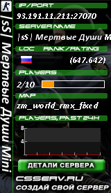 IP адрес: 93.191.11.211:27070 Данные по серверу были обнавлены 18.04.2026 10:20 Название сервера: |sS| Мертвые Души Mini Текущая карта: zm_army_tn_beta3 На сервере сейчас играют: 2 / 10 игроков Ранг: 449 (-8) (673.64 онлайн+голоса) CЕРВЕР В СПИСКЕ на 5 странице |
