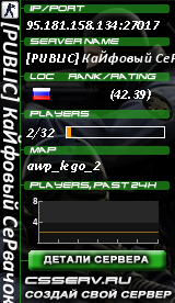 95.181.158.134:27017 | [PUBLIC] КаЙфовый СеРвачок ~ VIP FREE ~ | de_kabul_32 |